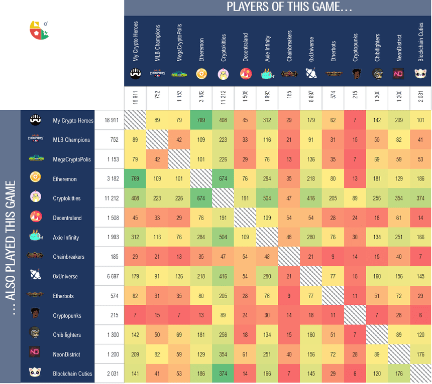 MyCryptoHeroes is by far the most “isolated” project, with 93% of players not playing a single other blockchain game.