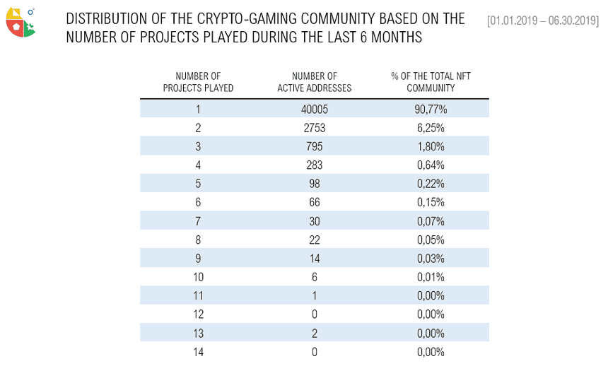 We have identified 44,075 unique active addresses across all 14 projects in the first 6 months of 2019. This statistic does not cover all players in ALL NFT projects, nor does it cover projects using the standard ERC-1155 (Enjin).
