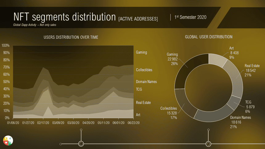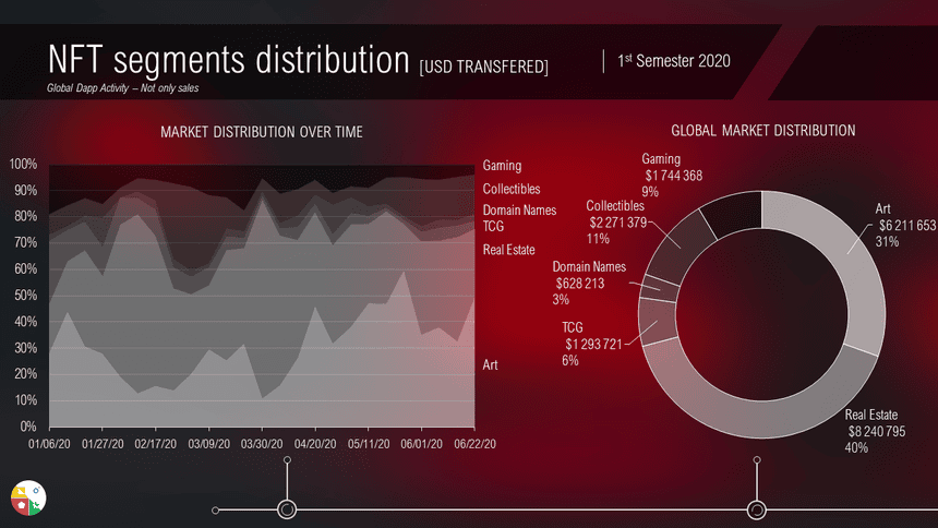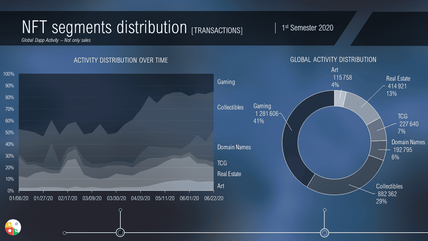 In the first half of 2020, Blockchain Gaming still represents the largest part of the ecosystem (41%), before Collectibles (29%) Domain Names, TCG, Real Estate and Art occupy the remaining 30%.