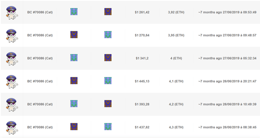 Here, we can see an asset (BC # 700086) being exchanged 6 times in less than 24 hours between the two same addresses (cf. wallet thumbnails).