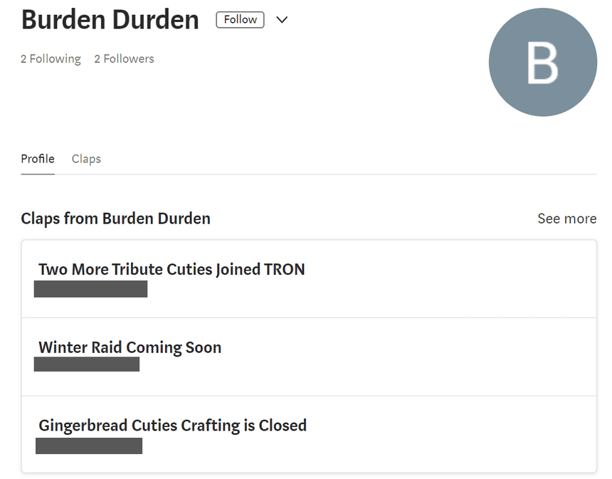 - The account clapped ONLY articles from the suspect NFT account (and generally the “Claps” tab shows us that the one and only activity of this profile is to clap articles published by the account.