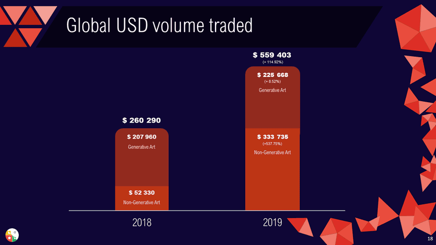 The volume of dollars traded only in the NFT art segment more than doubled between 2018 and 2019 (+114%). 2018 was marked by the very strong presence of so-called generative works with the secondary market around CryptoPunks. 2019 has seen a massive take-off from the non-generative art market.