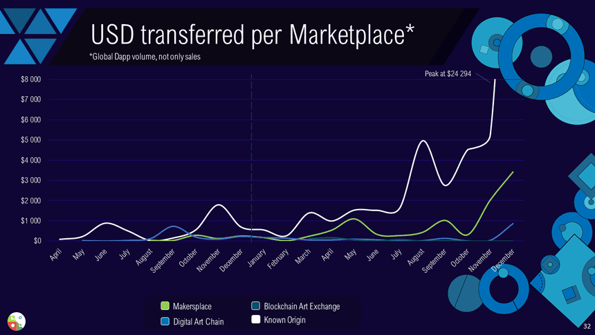 SuperRare and KnownOrigin dominate the market by far in terms of sales volume and USD transferred. (Note that SuperRare was presented on another graphic in the Art Report, due to its very large volume)