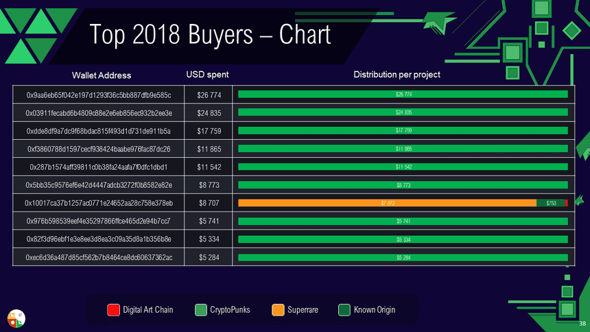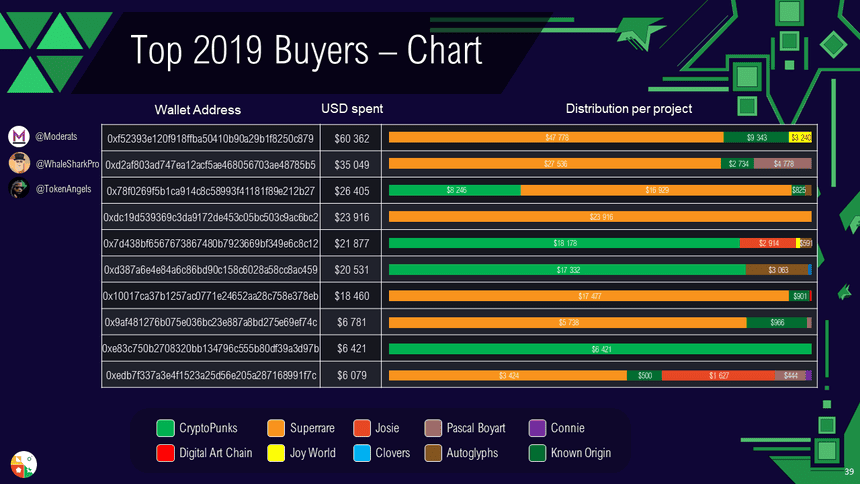 Between 2018 and 2019, the behavior of buyers has changed considerably. The portfolios of the biggest collectors have gone from a very strong focus on CryptoPunks to fairly diverse wallets.