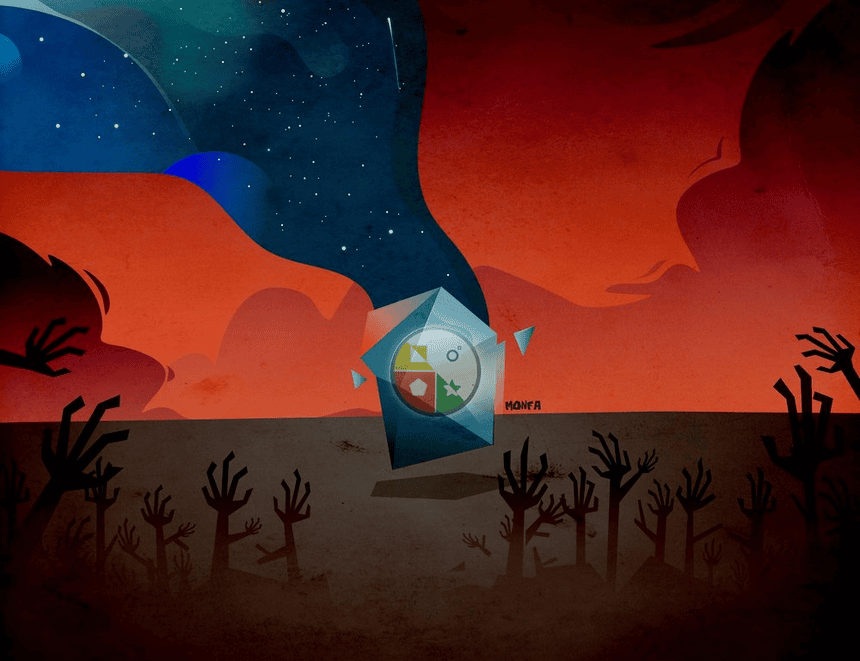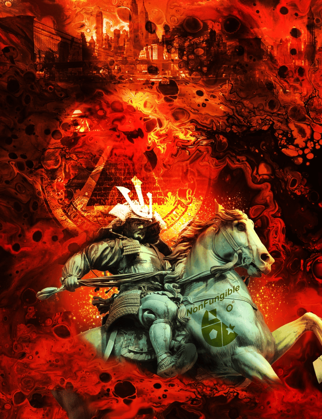 To break free from the historical controlling points and enter a new era of trade. Using the warrior and horse from the past that was once the tools of change many years ago, here comes to symbolize the powerful new medium of the blockchain as it is moving forward into new territories leaving behind the old trading territories on the distance horizon expressed by the city view and a hinted dollar bill pyramid mixed into an organic red textured background.