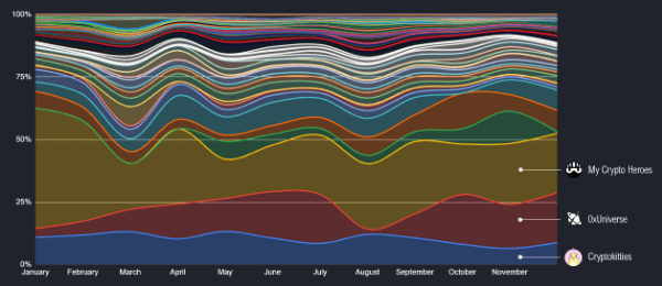 Between January and December 2019, CryptoKitties, 0xUniverse and MyCryptoHeroes 4 times represent more than 50% of the entire blockchain gaming community on Ethereum.