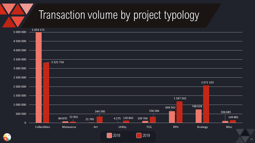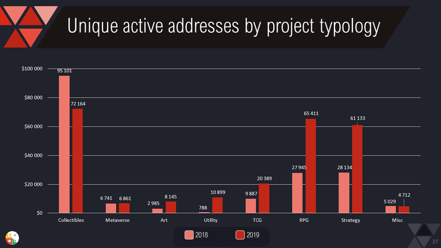 RPGs came in second place in terms of player volumes, while TCGs more than doubled their transaction volume and active addresses.