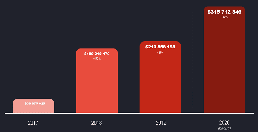 The Market Cap of the NFT ecosystem, all projects and all assets totaled $210M in 2019, with a Market Cap forecast of $315M.