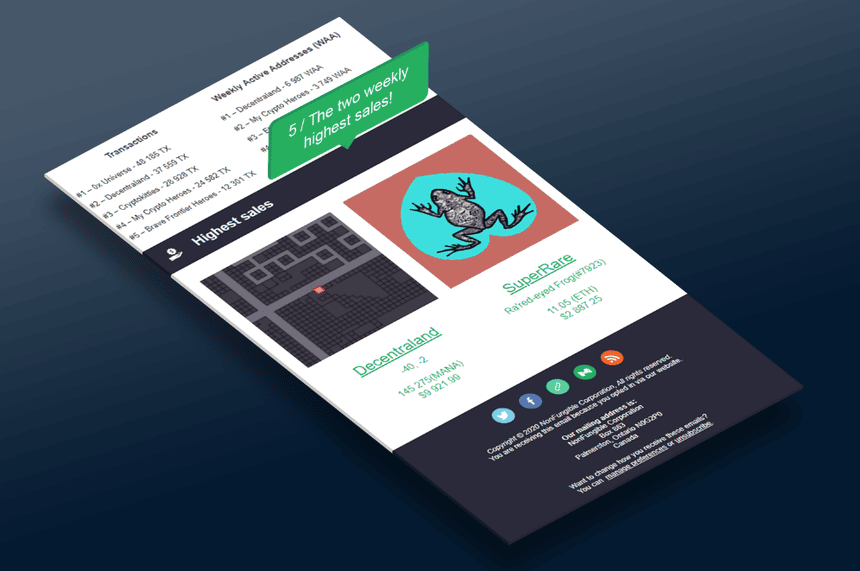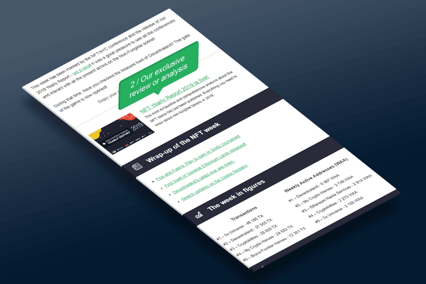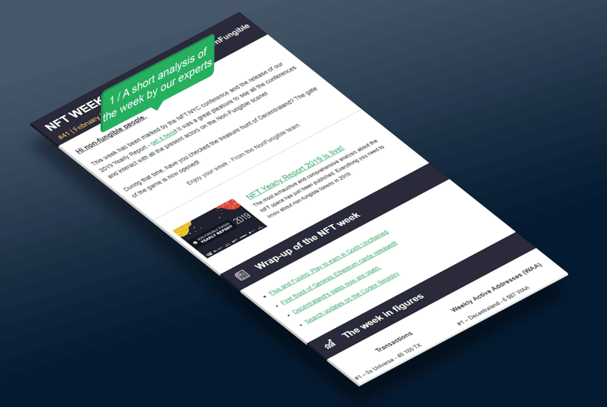 Each newsletter begins with an editorial written by our NFT experts, who offer a quick overview of the past week, and offer an analysis of the main trends they have observed over the past 7 days. It is also an opportunity to read about major announcements of projects or notable market developments.