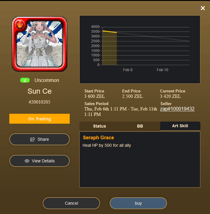 - 1 ETH = 10.000 ZEL. The price of the 4 legendary characters (the most expensive) was 20,000 ZIL and their price increased with each sale.