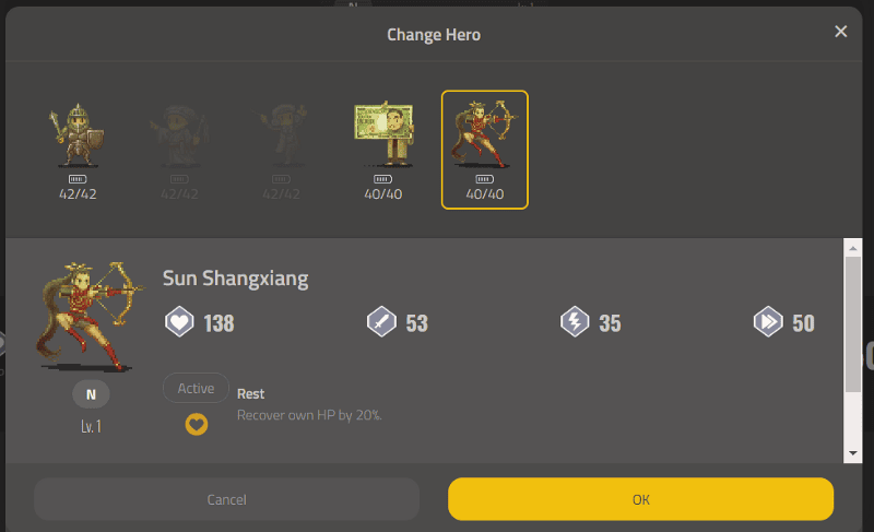 Once you’ve chosen heroes, you can equip your heroes with 2 objects each (left hand / right hand). Our strategy is to generally take equipment that compensates for their biggest weak point (defense, point of life, …) and choose the second equipment to strengthen the strong point of the hero.