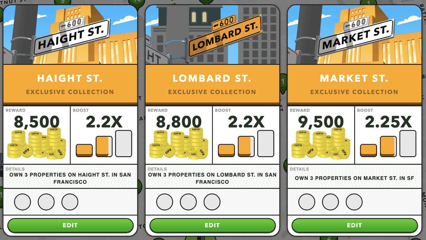 If you don’t know where to start, the easiest way is to try to complete the collections. It will not only get you a one-time reward but also a recurrent earnings boost from your properties. What could be better than earning money while asleep?