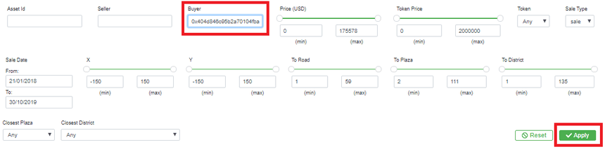 2 – Delete the search field “Seller” and copy the address ETH in “Buyer” to identify the list of assets purchased, then click on “Apply“