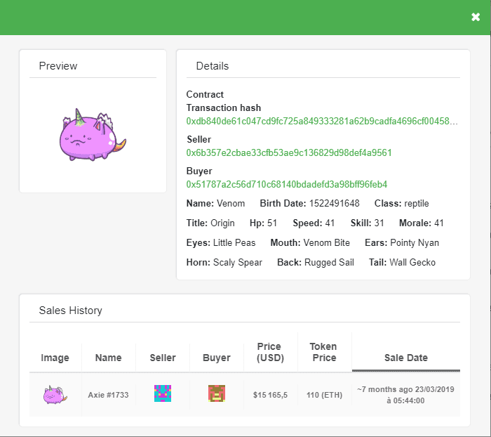 3 – The most expensive Axie of all time has been sold in March 2019 for 110 ETH, or $15,165