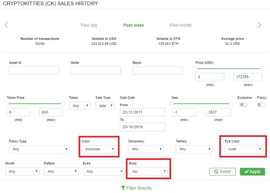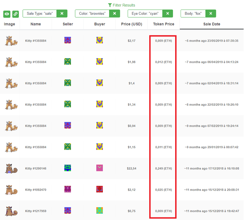 3 – It appears that the average price of a CryptoKitties is about 0.010 ETH. It will still be necessary to check the precise Cattributes of the Kitties which have sold more expensive, to check that they do not have a complementary “Cattribute” which makes them more rare