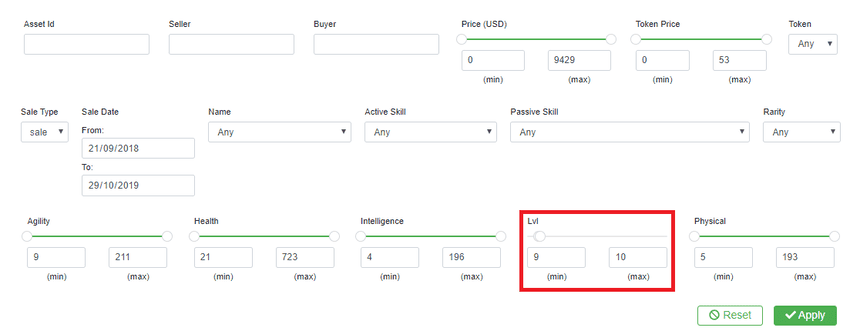 3- Filter sales on level 9 and 10 heroes then click on “Apply“